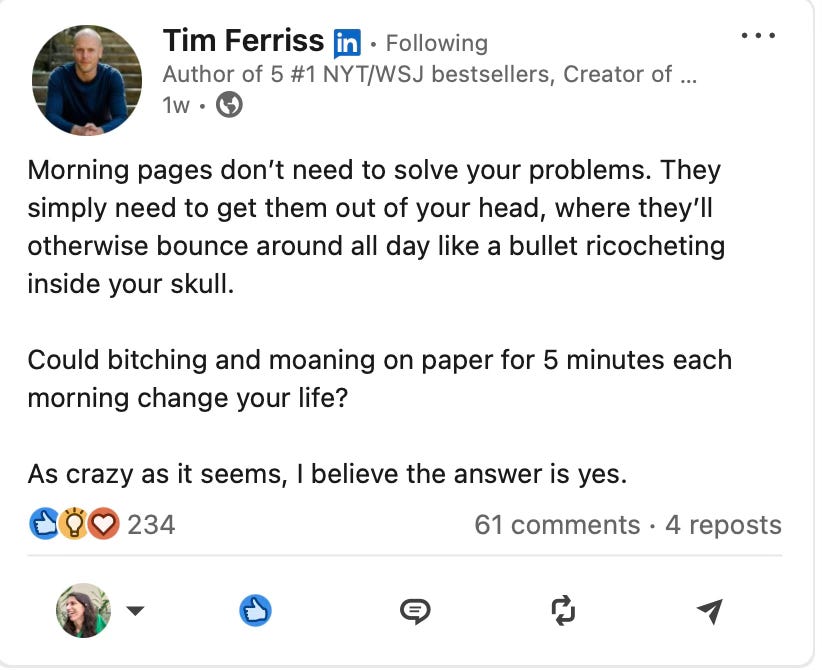 Tim Ferris, who is the author of 5 NYT bestsellers, goes on to say this about morning pages: